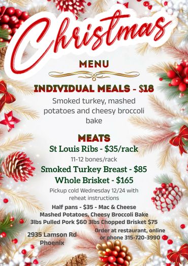Pre-order and pay by 12/19 for pickup on 12/24, 12-4pm. Meals will be picked up cold with warming instructions provided. Once submitted we will be in contact to arrange payment.